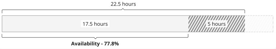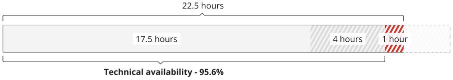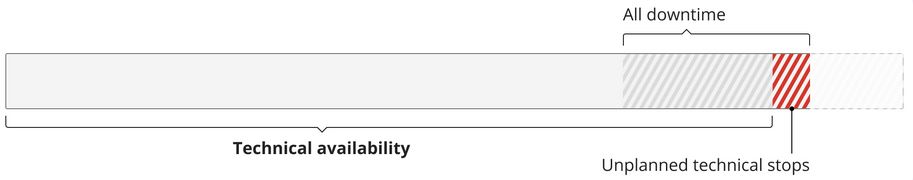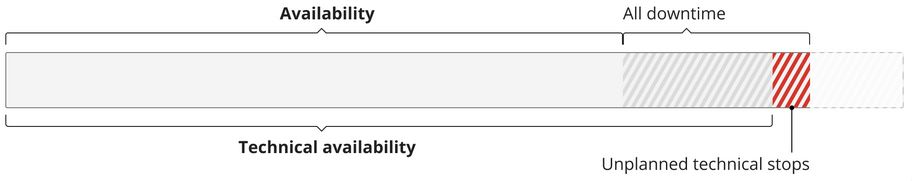 I “teknisk tilgængelighed” (eller “technical availability”) medregner vi kun de tekniske stop. På den måde kan vi se, hvor stor en del af den planlagte produktion, hvor vi oplever “tekniske stop”.